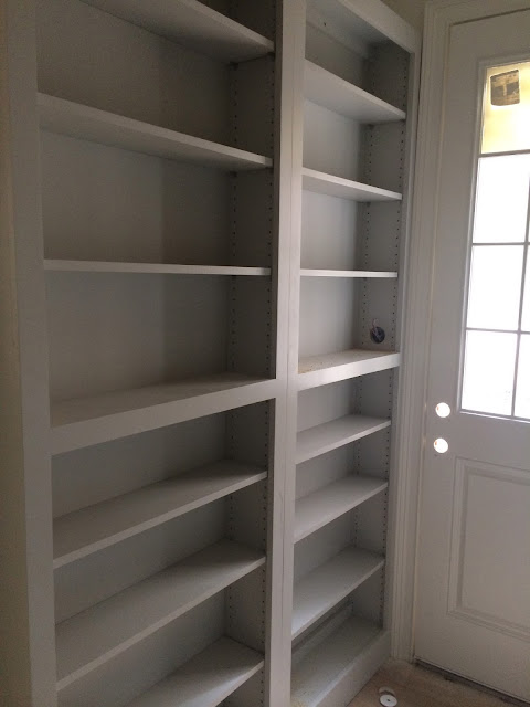 This is the pantry right off the kitchen. I wanted something different in this little spot, so I went gray on the cabinetry. No doors yet obviously. This is where my collection of tableware and glassware will be living with lots of room to expand. Which delights the hoarder inside me to no end.